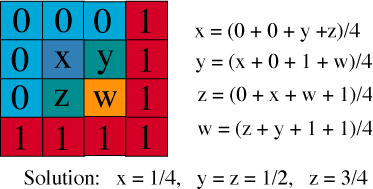 When there is just one interior cell, as in the three-by-three grid above, simple arithmetic is enough to solve the problem using the mean value principle. When the grid is larger, say, four-by-four, as in the figure below, the mean value principle yields a system of four equations in four unknowns.