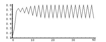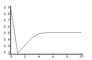 f(x) = kx(1-x)Unfortunately, there is no simple formula for the population sequence { x_n }, so we must use other tools to analyze its behavior. One approach is to generate the sequence using a simple computer program, then graph the results. When the initial population is 0.1 units and k = 2, we get this: