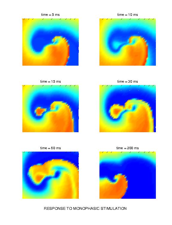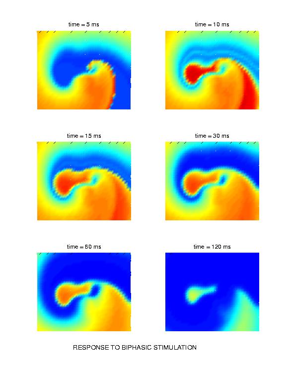 We demonstrate that a biphasic shock is more effective than a monophasic shock at eliminating reentrant electrical activity in an ionic model of cardiac ventricular electrical activity. This effectiveness results from early hyperpolarization that enhances the recovery of sodium inactivation, thereby enabling earlier activation of recovering cells. The effect can be seen easily in a model of a single cell and also in a cable model with a ring of excitable cells. Finally, we demonstrate the phenomenon in a two-dimensional model of cardiac tissue.